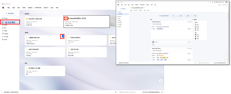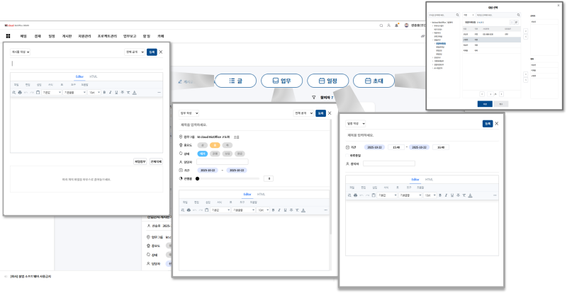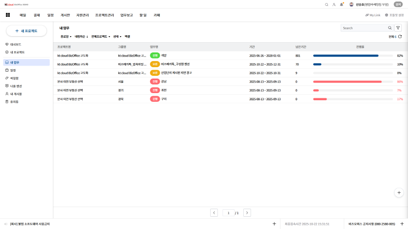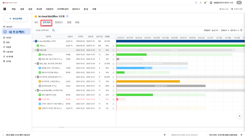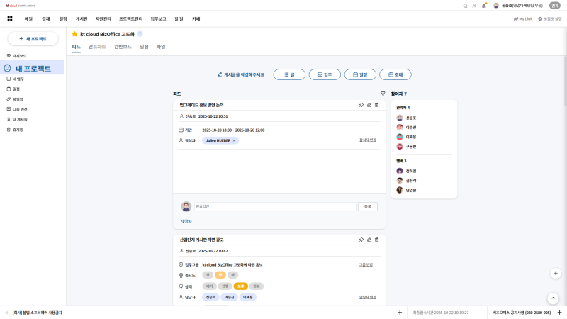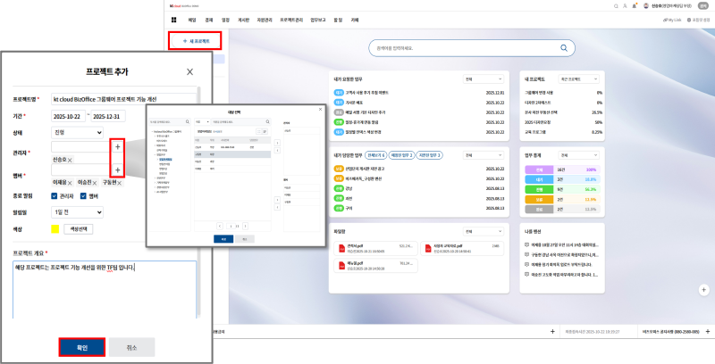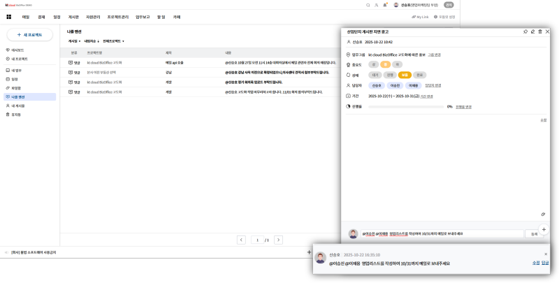 kt비즈오피스 그룹웨어 내 프로젝트 관리 기능이 업그레이드로, 업무를 관리하고 커뮤니케이션 속도도 향상되었습니다.