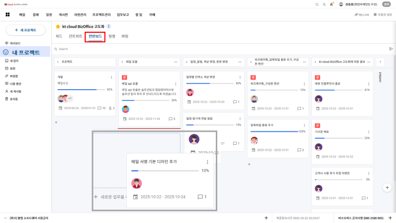 각 업무를 카드 형태로 파악이 가능하며, 마우스 드래그로 업무를 이동시킬 수 있습니다.