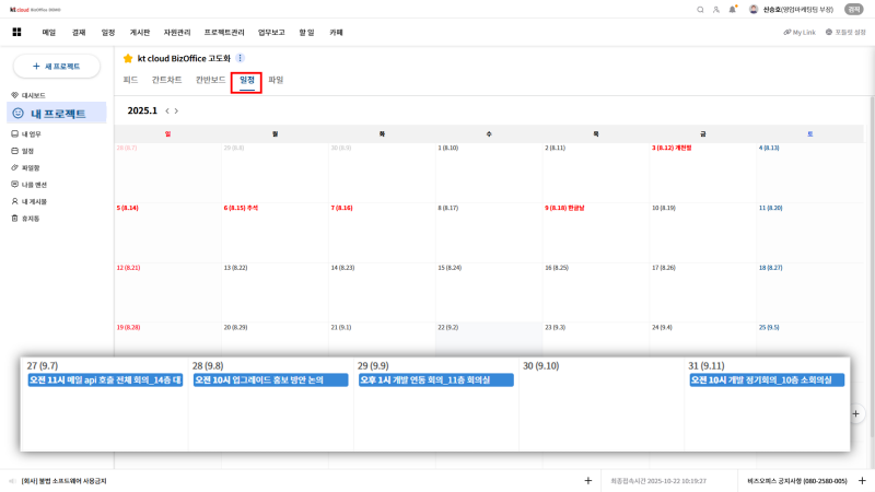 일정을 통해 프로젝트 회의를 확인하여 업무 정보를 확인할 수 있습니다.